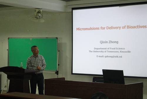 近日,美国田纳西大学终身教授、我校闽江学者讲座教授钟启新应邀来我校食品与生物工程学院进行学术交流,并作题为“Microemulsions for Delivery of Bioactivies”的学术报告。报告由学院院长刘光明主持,学院教师代表及全体研究生聆听了报告。