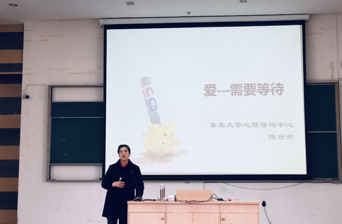 3月6日下午,外国语学院举办“爱,需要等待”主题讲座,讲座由校心理咨询中心陈世卿老师主讲。学院2018级全体女生聆听了讲座。