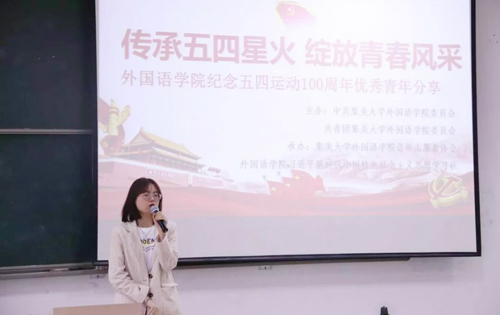 近日,外国语学院举办“传承五四星火,绽放青春风采”纪念五四运动100周年优秀青年分享活动。学院党委副书记陈雅珍、团委负责老师、各年级辅导员和各班学生代表参加了活动。