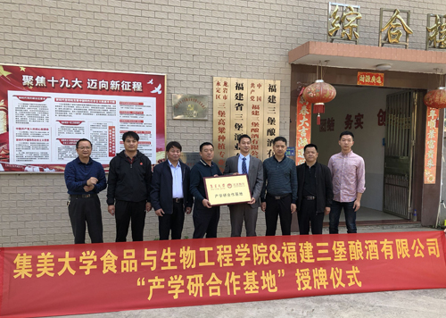 11月26日,我校食品与生物工程学院与福建三堡酿酒有限公司“产学研合作基地”授牌仪式在福建三堡酿酒有限公司举行。学院副院长倪辉,龙岩市永定区堂堡乡乡长李建熔,福建三堡酿酒有限公司董事长和有关人员参加了仪式。