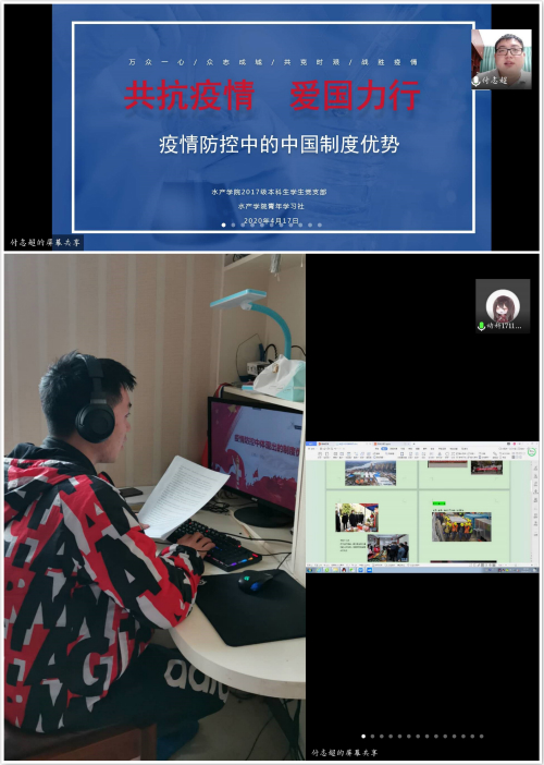 为有效引导学生坚定爱国力行决心,把“共抗疫情、爱国力行”主题教育活动引向深入,近日,水产学院2017级本科生学生党支部和学院习近平新时代中国特色社会主义思想青年学习社共同开展“共抗疫情、爱国力行”疫情防控中的中国制度优势主题教育学习活动。