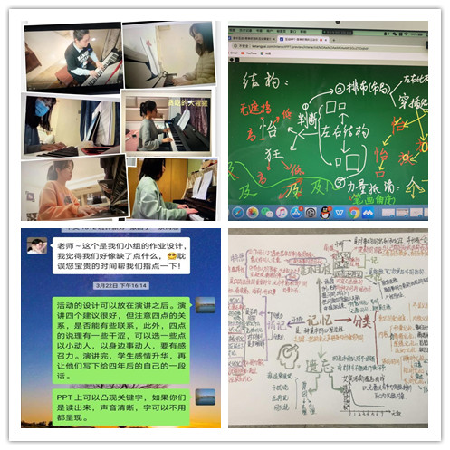 学院线上教学形式多样、内容丰富,课上师生积极互动,课下学生小组进行互动交流。在线上教学过程中,学院教师们依据不同课程的性质,积极调整教学方案。书法课、钢琴课等技能课程,通过调整教学内容和借助新媒体等手段加强对学生的技能指导,精心布置和点评作业,促进课上课下良好衔接;理论课程则针对已学内容,布置思维导图作业,分主题、分组让学生绘制思维导图,对知识进行巩固。