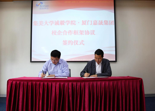 4月27日下午,诚毅学院与厦门嘉晟集团在其总部举行校企合作框架协议签约仪式。诚毅学院党委书记林斯丰,学院对外交流合作部、经济系、商船系相关负责人,嘉晟集团总裁吴亚强、执行总裁陈永火、副总裁姜嵘等参加了签约仪式。