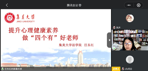 为进一步做好疫情防控期间的教育引导和心理疏导工作,保障师生生命安全和身心健康,5月20日,法学院举行全院教职工视频大会暨心理健康辅导讲座,视频会议由院党委书记黄煜主持,社会学系副教授巨东红作题为《提升心理健康素养,做“四个有”好老师》的心理健康辅导讲座。全体行政人员在尚大楼810会议室参加会议,专任教师以腾讯会议方式参加会议。