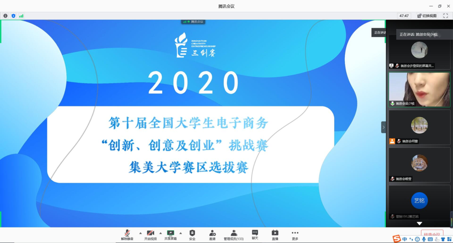 6月24日,由工商管理学院承办的第十届全国大学生电子商务“创新、创意及创业”挑战赛亚洲中文精品乱码赛区决赛线上开赛,比赛邀请到学院优秀校友谢志锋、余思巧,以及学院电子商务系张仪华、市场营销系范薇薇、工商管理系庄贝妮老师担任评委,100余位学生在线观摩。