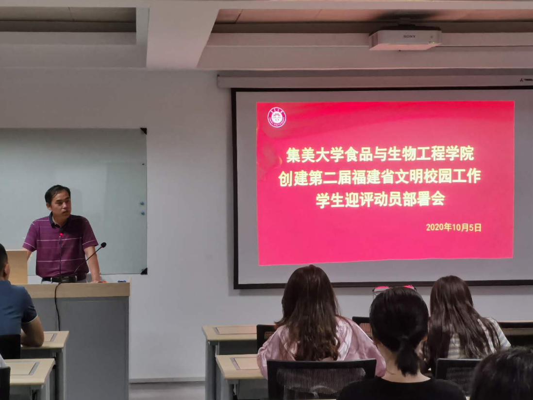10月5日,食品与生物工程学院召开创建第二届福建省文明校园工作学生迎评动员部署会。院党委副书记朱坤道、各年级辅导员出席,院学生会、研究生会、自律会主要干部和各班班长、团支书参加了此次动员会。