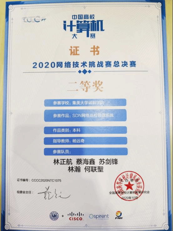 近日,2020年第五届中国高校计算机大赛“网络技术挑战赛”全国总决赛在温州举行。由诚毅学院林正航、何联聖、蔡海鑫、林瀚、苏剑锋五位学生组成的参赛队伍获得全国总决赛二等奖。本次比赛由诚毅学院信息工程系杨远奇担任指导教师。