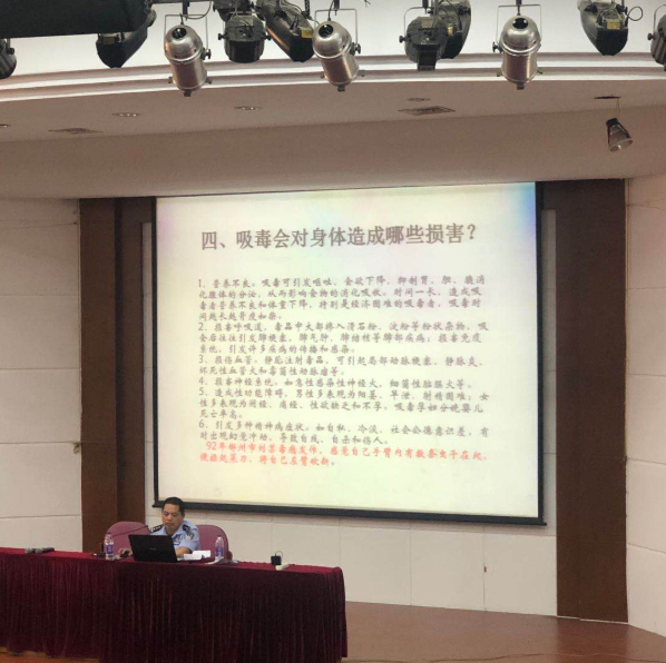 朱仕灶从毒品的种类入手,向同学们普及毒品的基本概念;强调毒品的危害性,提高学生识毒、防毒、拒毒意识;强化防毒措施,树立“自警自省,预防为主”意识等,对如何充分认识毒品危害、如何防止吸毒、如何提升自我预防毒害做了强调;又通过案例分析、毒品样品图片展示等直观形式,告诫同学们要远离毒品,自觉抵制毒品,树立自我保护意识。
