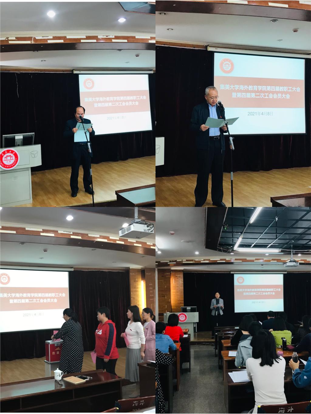 4月8日下午,海外教育学院在学院三楼多功能厅召开第四届教职工大会暨第四届第二次工会会员大会,学院全体教职工参加会议。会议由学院党委副书记陈茂才主持。