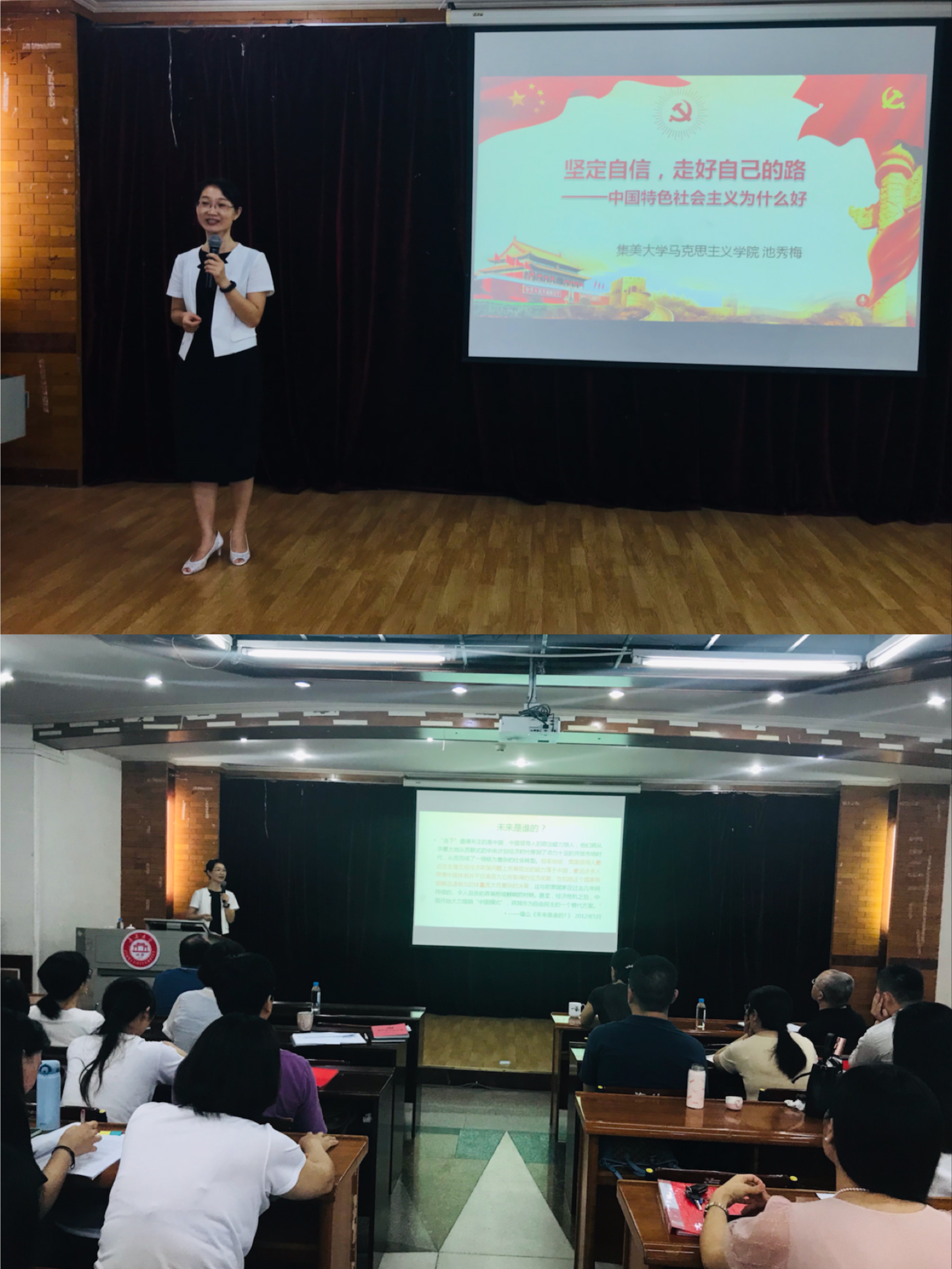 池秀梅从“中国特色社会主义从何而来”“中国特色社会主义‘特’在何处”“中国特色社会主义为什么好”三个方面展开宣讲,结合丰富详实的图文资料,深入阐述中国特色社会主义制度的优越性。