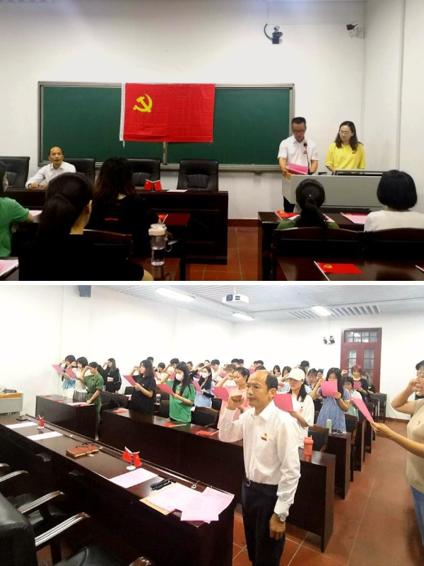 宣誓仪式在雄壮的《国际歌》中拉开序幕。在领誓人闫铄瓒,监视人李俊法的带领下,全体党员面向党旗,高举右手庄严宣誓,重温自己对党忠诚的誓言。随后,新党员吴珊珊,代表全体党员发言。她表示会坚决以实际行动履行誓言,为党旗争辉,无愧于共产党员光荣称号,更加坚定共产主义理想信念,践行嘉庚精神。