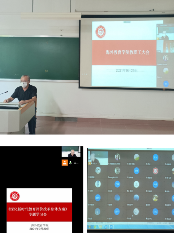 9月29日下午,海外教育学院举办《深化新时代教育评价改革总体方案》线上专题学习会,会议由副院长陈同文主持,全院教职工参加。