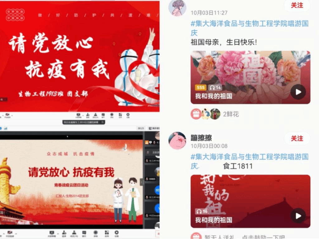 恰逢国庆假期,为丰富学生国庆期间的课余生活,增强疫情防控期间的责任意识,海洋食品与生物工程学院开展了“请党放心,抗疫有我”青春战疫云团日活动和“唱游国庆”线上K歌会。