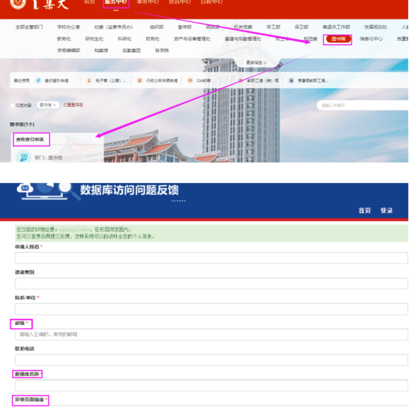 数据库访问故障上报系统的开通,可及时解决师生读者在数据库访问时遇到的问题,更好地提供图书馆数字资源保障服务。此系统在各数据库的说明页面最后一行均有链接。