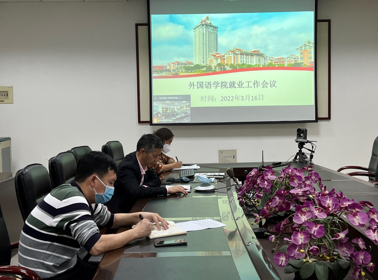 3月16日下午外国语学院召开就业工作会议,院党委书记王文辉、院长张海燕、院党委副书记李铭钊及各系主任、团委书记、毕业班班主任老师参加视频会议。会议由李铭钊副书记主持。