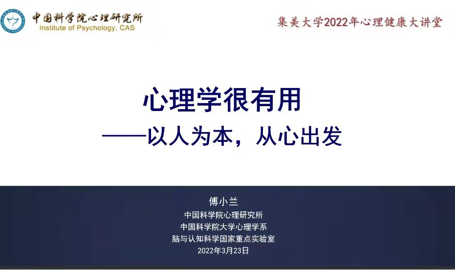 面对当前严峻复杂的疫情防控形势,为帮助学生更好地调节心理状态,3月23日晚,校心理咨询中心举办了“心理学很有用”为主题的线上心理讲座。本次讲座由中科院心理所所长、博导傅小兰教授主讲,近4000名同学聆听了讲座。