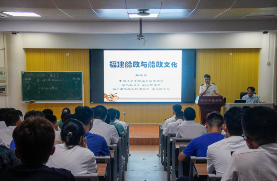 4月28日晚,轮机工程学院在育志楼227举办“薪火相传、共赴深蓝”航海文化系列教育活动之“福建船政与船政文化”讲座。讲座由中国造船工程学会船史研究学术委员会副主任委员、福州市船政文化研究会常委副会长林樱尧主讲,院党委副书记赖龙荣主持,辅导员、院航海文化培训班、院大骨班全体成员、部分学生代表聆听了讲座。