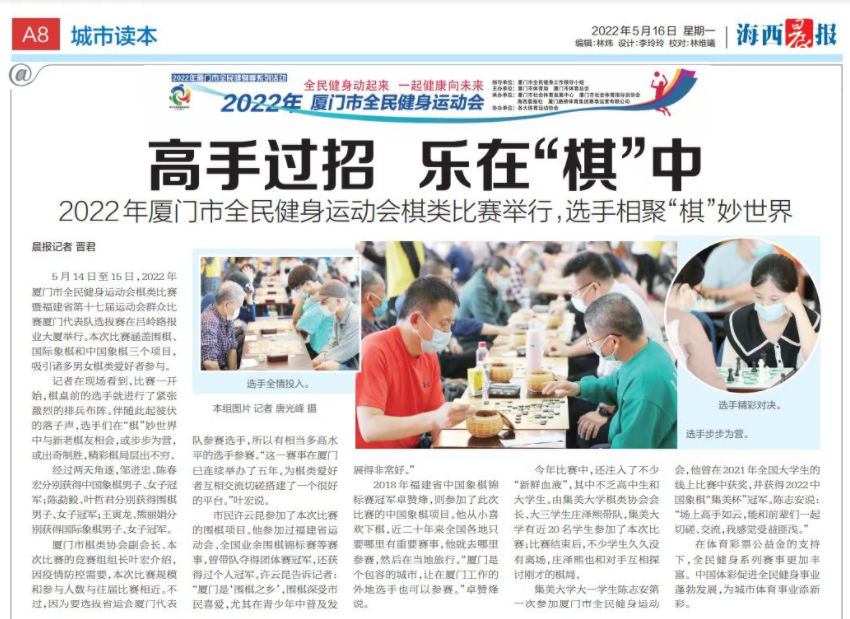为丰富校园文化生活,展现青年学生朝气蓬勃的精神风貌,助力文明校园建设,亚洲中文精品乱码学生棋类协会会长庄泽熙组织校内棋类爱好者于5月14日至15日参加由厦门日报报业大厦举办的厦门市全民健身运动会棋类比赛暨福建省第十七届运动会群众比赛厦门代表队选拔赛。棋协指导教师海洋文化与法律学院吴光辉老师全程指导比赛。
