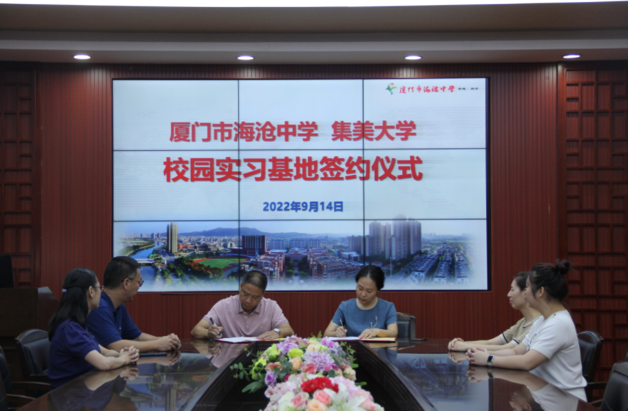 9月15日,音乐学院与厦门市海沧中学在海沧中学会议室举行共建实习基地签约仪式。仪式由海沧中学余伟副校长主持,音乐学院副院长滕腾、教学科研办刘敏、综合办公室佘颖俐、海沧中学党支部书记黄炜、音乐部负责人梁安雅共同出席签约仪式。