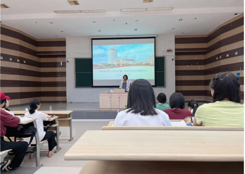 9月28日下午,外国语学院于美岭楼201室召开《学生手册》相关制度宣讲大会。本次大会由外国语学院团委书记姜如星主讲,外国语学院全体2022级新生参加。
