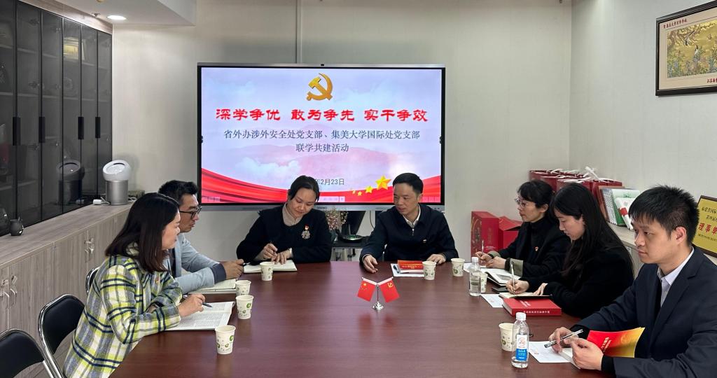 为进一步贯彻落实党的二十大精神,实现党建优势互学互补,近日,省外事涉外安全处党支部来我校同国际合作交流处党支部开展“深学争优 敢为争先 实干争效”联学共建活动。