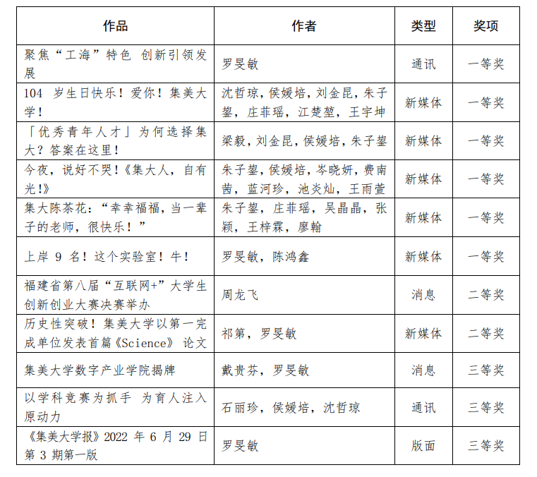近日,福建省高等教育学会高校宣传工作分会发布2022年度福建省高校好新闻评选结果,我校6件作品获一等奖,2件作品获二等奖,3件作品获三等奖。