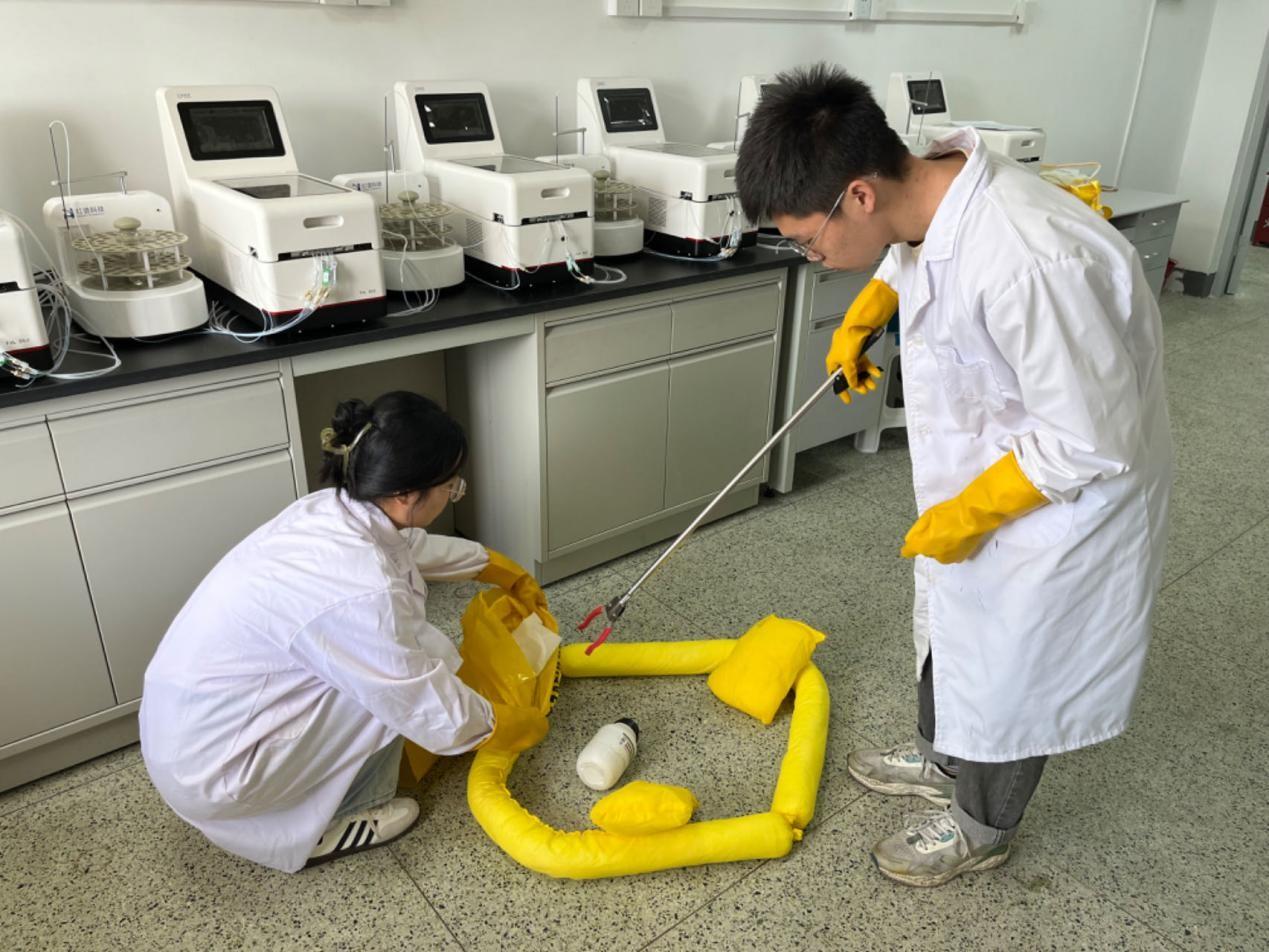 黄云凤强调了应急处置能力是实验室安全管理的重中之重,指出要开展常态化的应急演练,提高应急预案的科学性。实验室副主任巫晶晶介绍了特种设备、压力容器的应急预案机制。随后在集诚A海岸带环境综合检测室开展突发环境事件(危废泄漏)应急演练。内容包括泄漏应急套件内器材的使用介绍、老师和学生参与自救演练、实验室安全事故应急响应等。实验室安全专员陈华敏还以集诚楼A四楼消防疏散图为切入点,系统讲解了消防安全知识和实验室日常安全注意事项。
