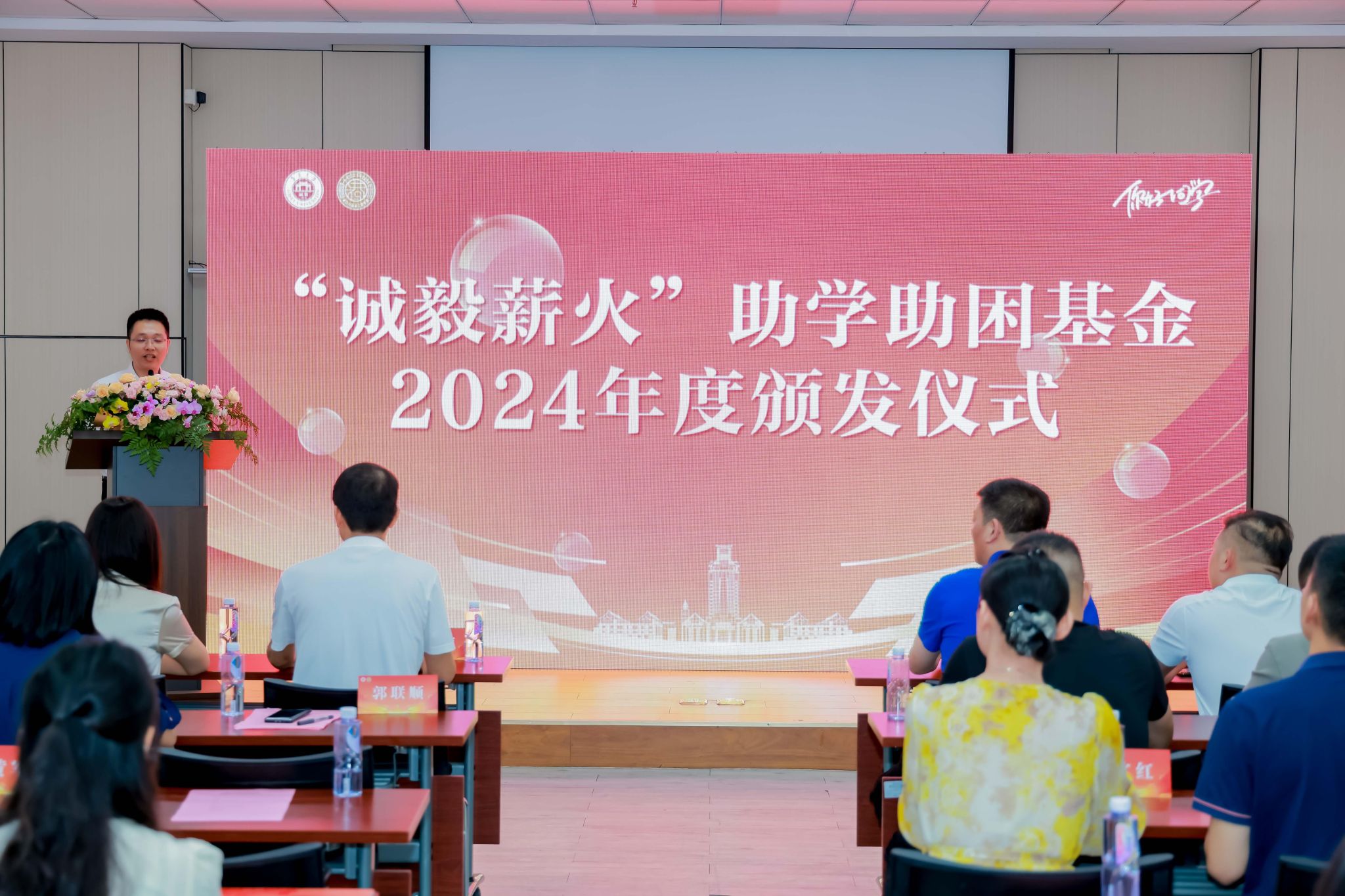 赵立代表陈云南先生致辞。他指出,设立助学助困基金旨在弘扬嘉庚精神,秉承“诚毅”校训,达到“薪火”相传的公益目的。这份基金不仅仅是经济上的支持,更是一份沉甸甸的责任与期望。他希望受资助学生牢记基金成立的初心,诚毅待人,毅以处事,始终保持一颗感恩的心,并将这份爱心一直传递下去。学院校友会执行会长王海源宣布2024年度受捐赠的名单。